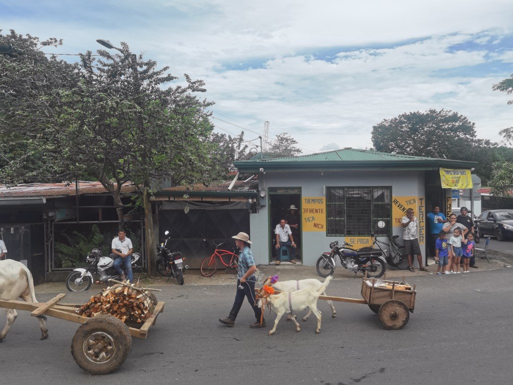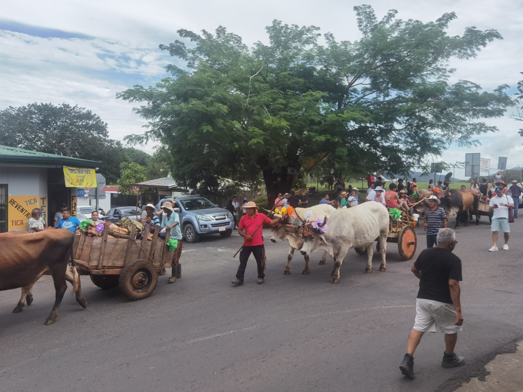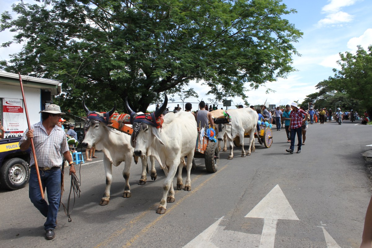 En medio de ese jolgorio, pasaban las jarreras con sus vestidos limpiecitos y engomados y sus trenzas negras adornadas con flores de resedas, príncipe negro, Rosaté o Chirco, repartiendo entre los que picaban leña y los mirones, los guacales de chicha o chicheme o las jícaras de tiste, que servían para refrescar el calor y reponer las energías gastadas en el trabajo a unos, y a terminar de llenar la panza a los que solo mirábamos el aire impregnado con el perfume de la madera de los árboles recién derribados y las flores de Pito y campánulas que por estos tiempos revientan en todos los montes vecinos a Nicoya. Entre las doce y la una del día, al grito del Nacume o del Mayordomo, que indicaba que ya había leña suficiente, se dejaba de picar, los hombres con sus hachas al hombro y sus machetes en la mano, empezaban a desfilar, mientras que las mujeres y los muchachos recogían los trastos, los cargaban en las carretas, y en fila india se iniciaba el regreso a la Cofradía, en donde ya estaba esperando el almuerzo con sus tortillas panzudas del tamaño de la luna llena y los platos de arroz con chancho, carne en baho (bajo), frijoles y ajiaco que harían las delicias de los que habían trabajado y también de los gastrónomos mirones. [Pedro Arauz Aguilar, 1970]